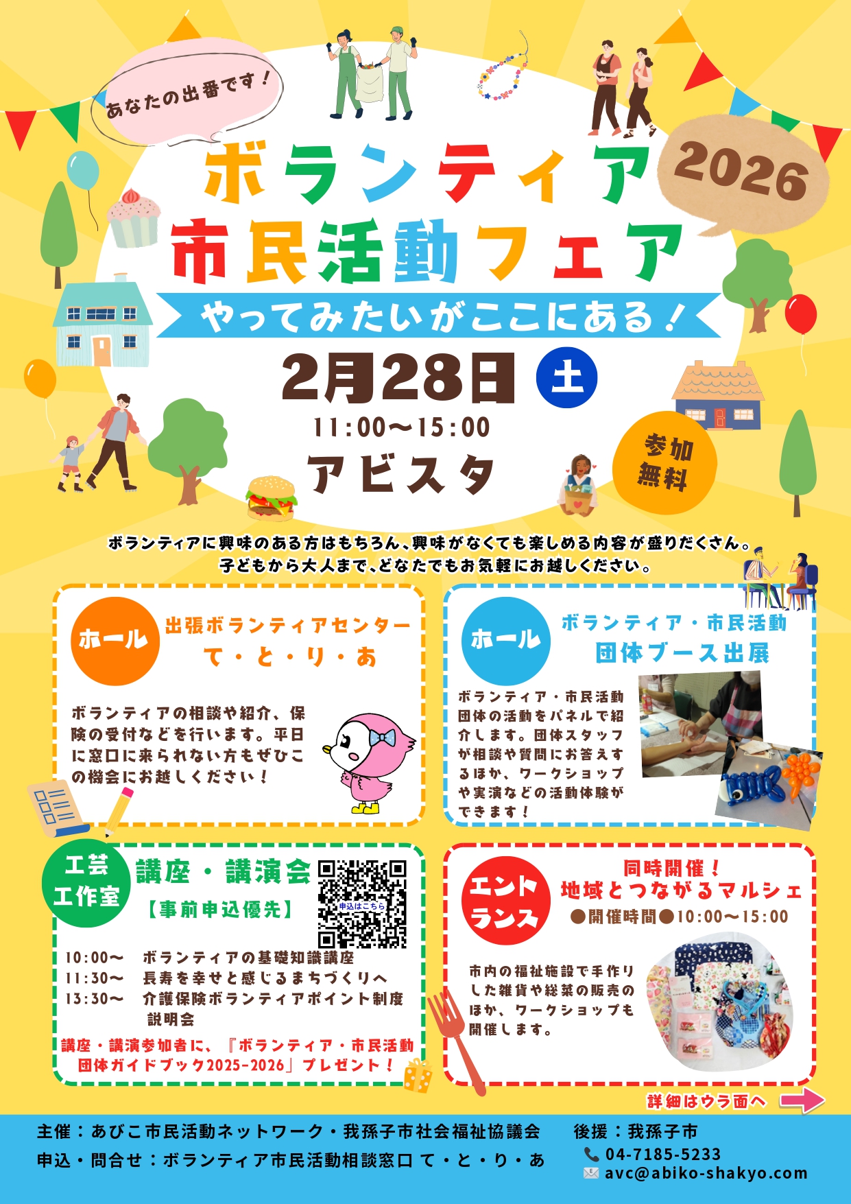 | 問い合わせ先 | ボランティア市民活動相談窓口 て・と・り・あ 04-7185-5233avc@abiko-shakyo.com |